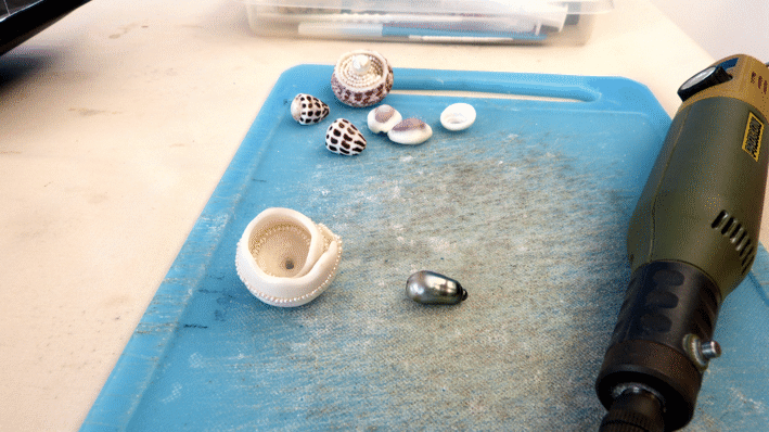 C'est presque toujours la nature qui fournit la base de mon travail. Je flâne sur les plages des îles que nous visitons à la recherche de matériau. Dans mon atelier à bord ou dans le cockpit de notre bateau, je commence par une présélection et je fais les premières mises en place pour un nouveau bijou. Les dessins sont toujours basés fonction du type et de la nature d'un objet trouvé.