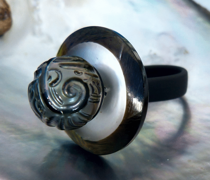 Knopfringe habe ich zum ersten Mal anlässlich meiner Ausstellung in Cartagena de Indias / Kolumbien 2009 entworfen und ausgestellt. Seitdem sind sie stetig von mir weiterentwickelt worden. Ausgangspunkt ist immer ein oder mehrere besonders schöne Knöpfe, die ich mit Edelsteinen oder Zuchtperlen kombiniere.