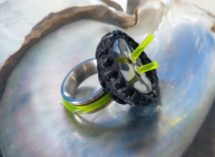 Die Ringschiene besteht aus Kautschukband, oder farbigem Kunststoff. Die Knöpfe stammen inzwischen aus allen Teilen der Erde. Sie sind aus Perlmutt, Holz, Glas, Kieselstein, Bakelit, Edelsteinen, Textilien, Papier oder Polymer. Die ältesten ihrer Art sind mehr als 100 Jahre alt. Obwohl ich von einigen dieser besonderen Knöpfe manchmal mehrere besitze, so ist doch jeder Knopfring ein Unikat, da die Zusammenstellung immer eine andere ist.
